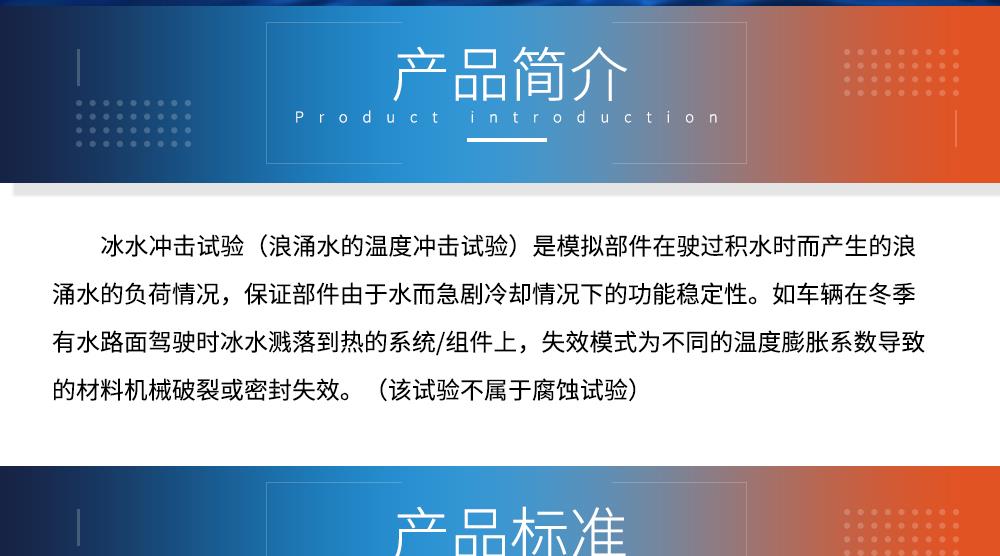 產品型號:JQCW-1000L 品牌:劍 喬 用途:冰水沖擊試驗(浪涌水的溫度沖擊試驗)是模擬部件在駛過積水時而產生的浪涌水的負荷情況,保證部件由于水而急劇冷卻情況下的功能穩定性。如車輛在冬季有水路面駕駛時冰水濺落到熱的系統/組件上,失效模式為不同的溫度膨脹系數導致的材料機械破裂或密封失效咨詢熱線:13829135130