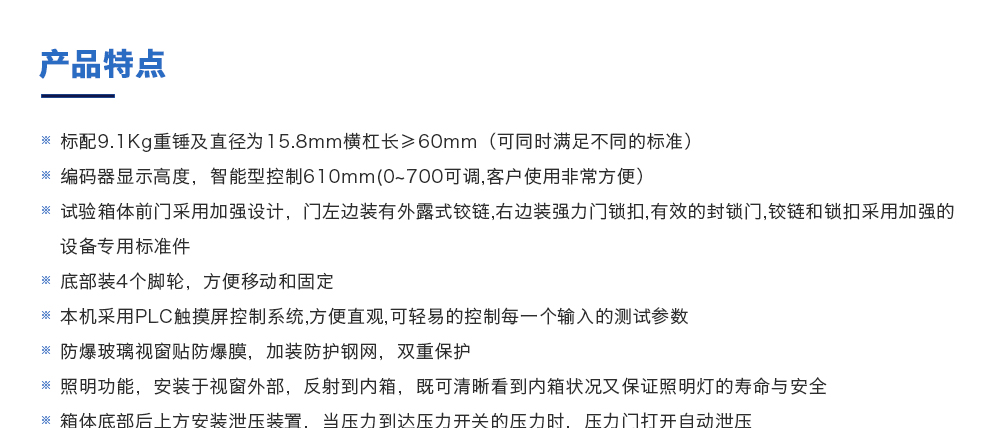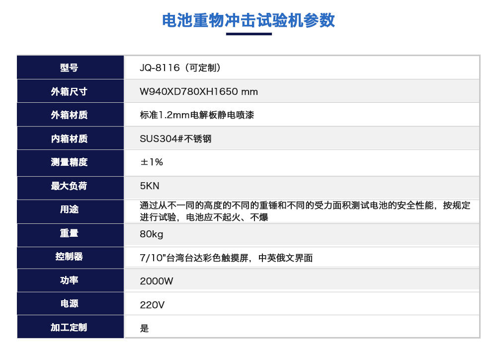 產(chǎn)品型號:JQ-8116(定制款) 品牌:劍 喬 用途:電池重物沖擊試驗機是模擬通過從不一同的高度的不同的重錘和不同的受力面積測試電池的安全性能,按規(guī)定進(jìn)行試驗,電池應(yīng)不起火、不爆炸。也是各電池廠家及研究所必不可少的檢咨詢熱線:13829135130