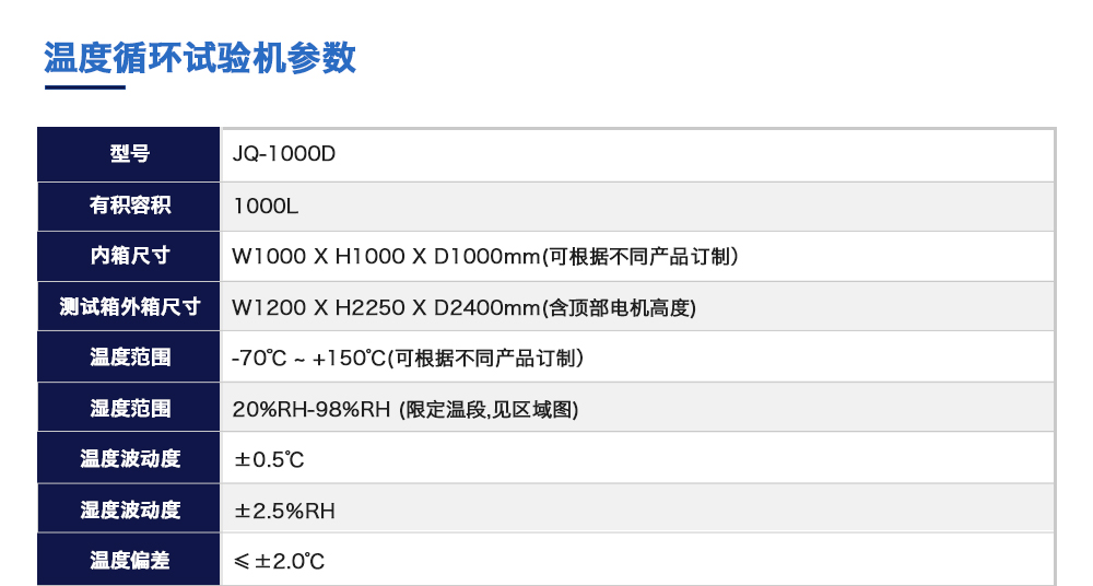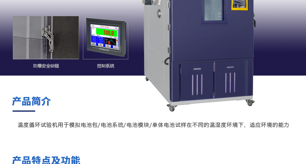 產品型號:JQ-1000D 品牌:劍 喬 用途:溫度循環(huán)試驗機用于模擬電池包/電池系統(tǒng)/電池模塊/單體電池試樣在不同的溫濕度環(huán)境下,適應環(huán)境的能力咨詢熱線:13829135130